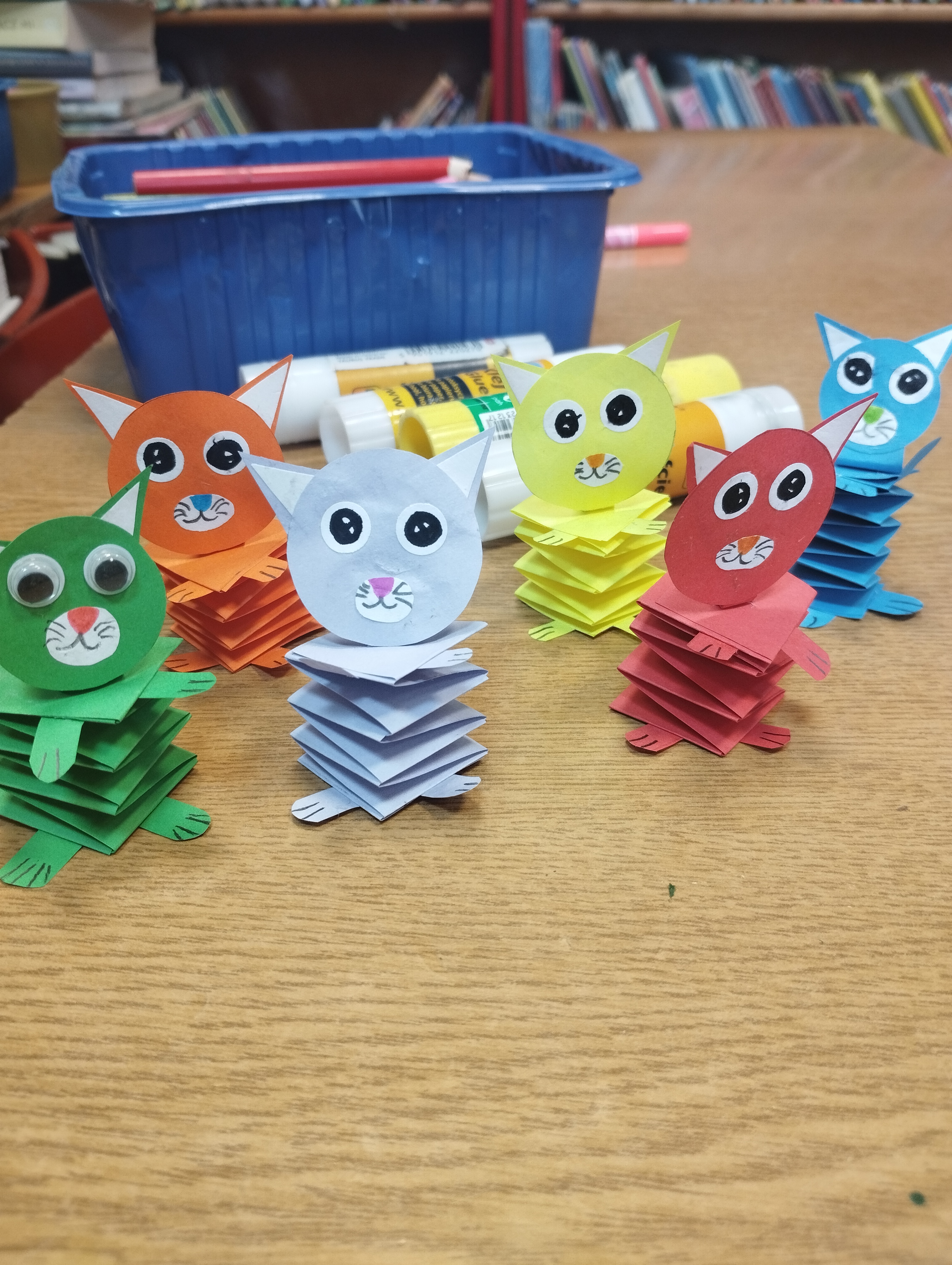 - Koty sprężynki: Z kolorowego papieru wyczarowaliśmy gibkie, wesołe zwierzaki, które dzięki swojej konstrukcji „ożywały” przy każdym dotknięciu.
