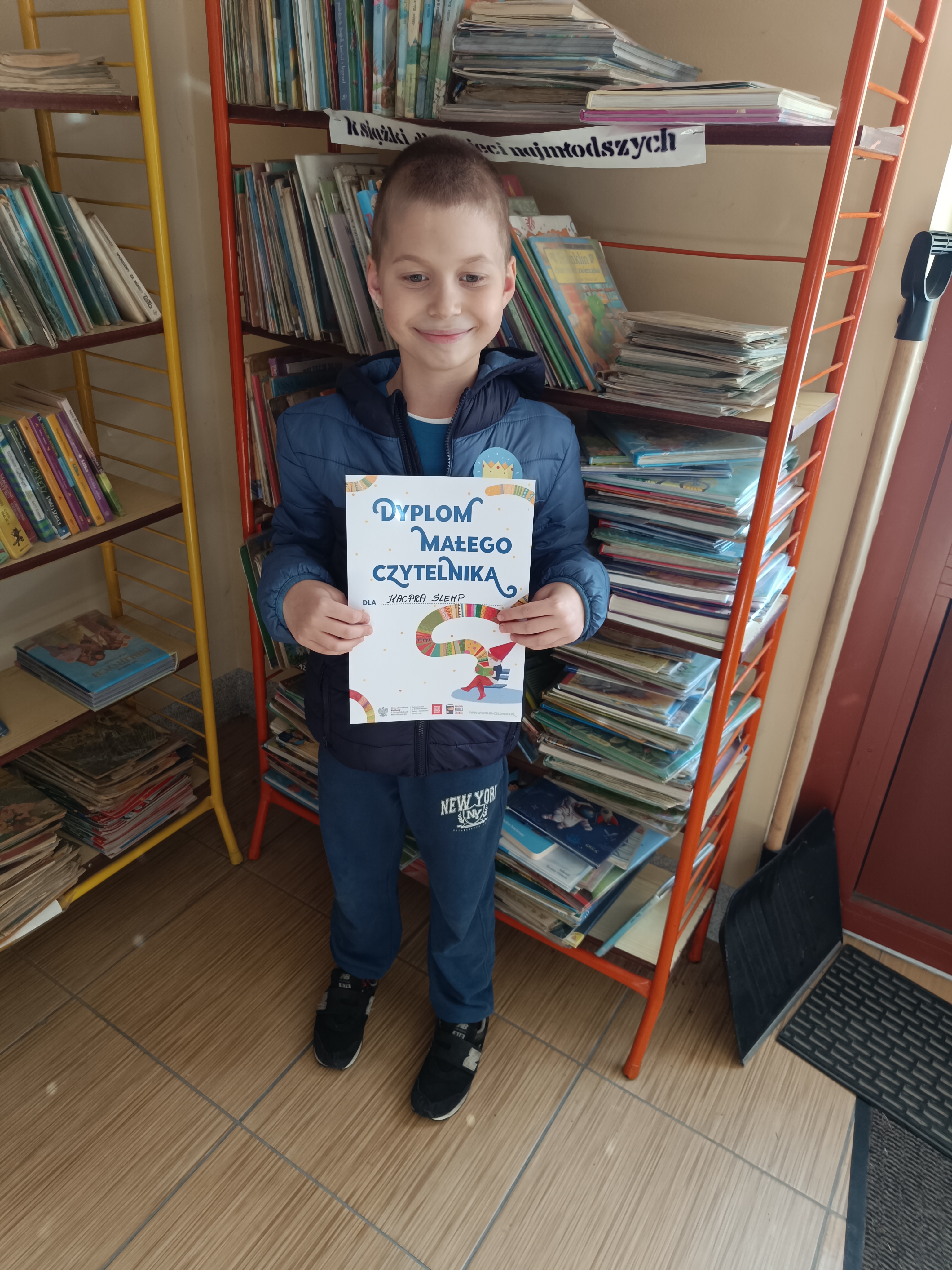 Kacper Ślemp uczeń szkoły podstawowej klasy 0 wziął udział w programie „Mała książka - wielki człowiek”. W zawiązku z tym uzbierał 10 naklejek na kartę małego czytelnika i otrzymał od biblioteki „Dyplom małego czytelnika” i drobne upominki.