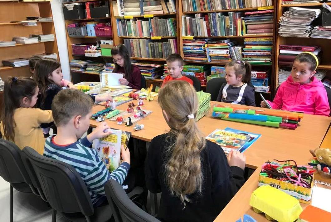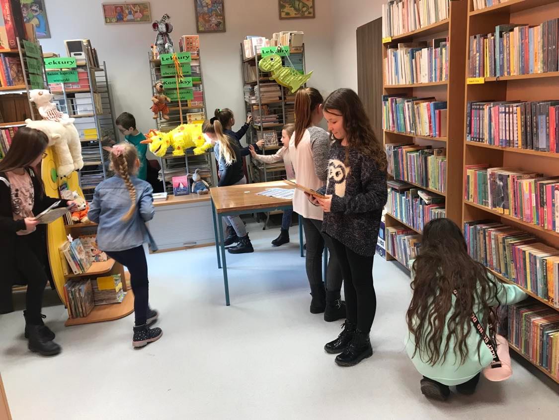 Pierwsze jajko poprowadziło dzieci do oszklonej szafy w holu biblioteki, w której mieściła się tematyczna wystawka książek. Tam czekały na nich kolejne jajka z konkurencjami.