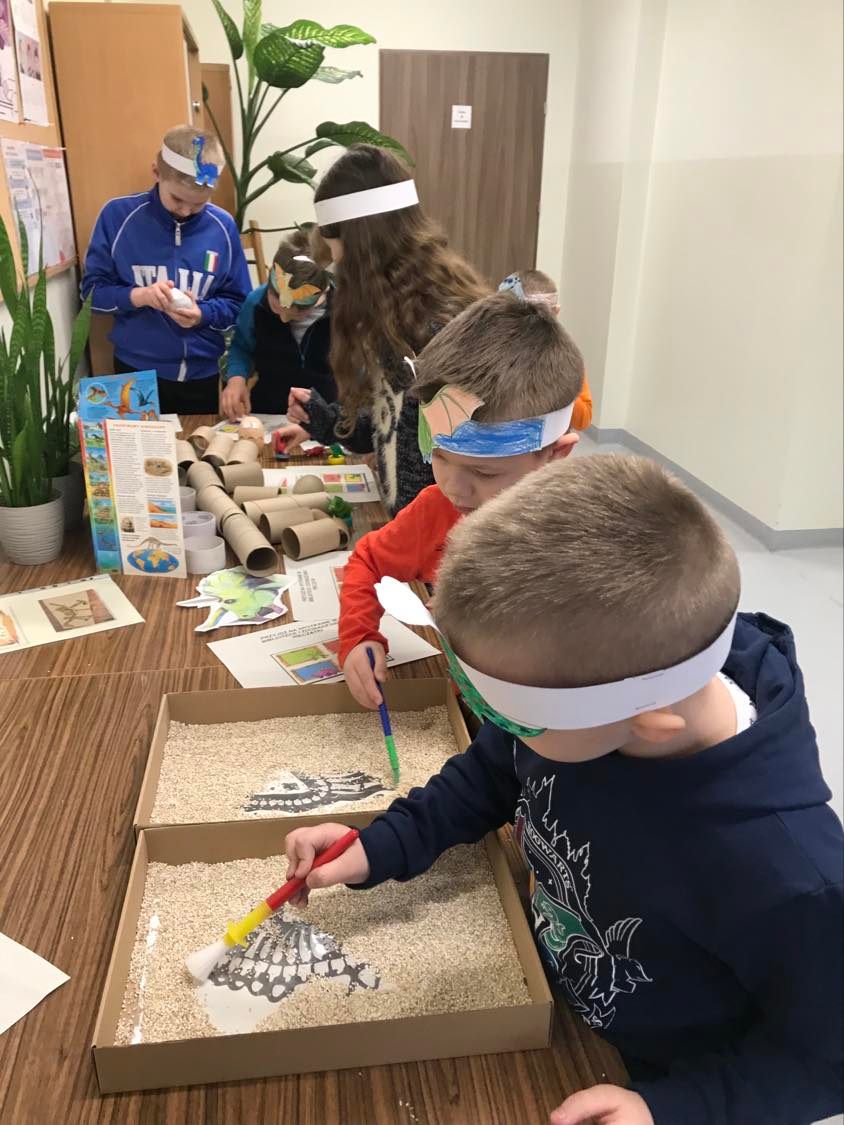 Bardzo spodobał się im pomysł odkopywania kości dinozaurów na obrazkach, ukrytych w pudełkach kartonowych przysypanych kaszą.