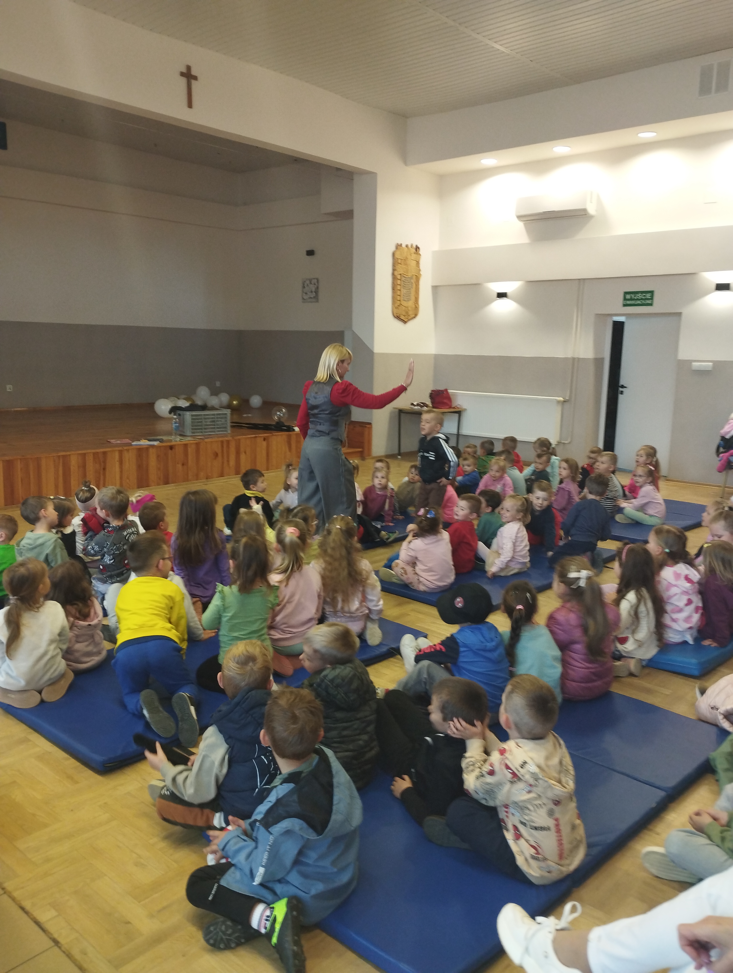 Pani Beata jak zawsze przywitała dzieci w iście teatralny sposób – z szerokim uśmiechem oraz zapowiedzią niespodzianki czekającej na najmłodszych. Jej sposób mówienia, gestykulacja i nieustanna zmienność głosu wprowadziły wszystkich w świat wyobraźni i zabawy. Dzieci natychmiast dały się porwać tej niezwykłej energii. Podczas spotkania z Panią Beatą dzieci miały możliwość wcielić się również w postacie z bajki pt. ,,Czerwony Kapturek”. Pełna ekspresji przekazana treść oraz ciekawe rekwizyty sprawiły, iż dzieci z wielkim zainteresowaniem oglądały inscenizację.
