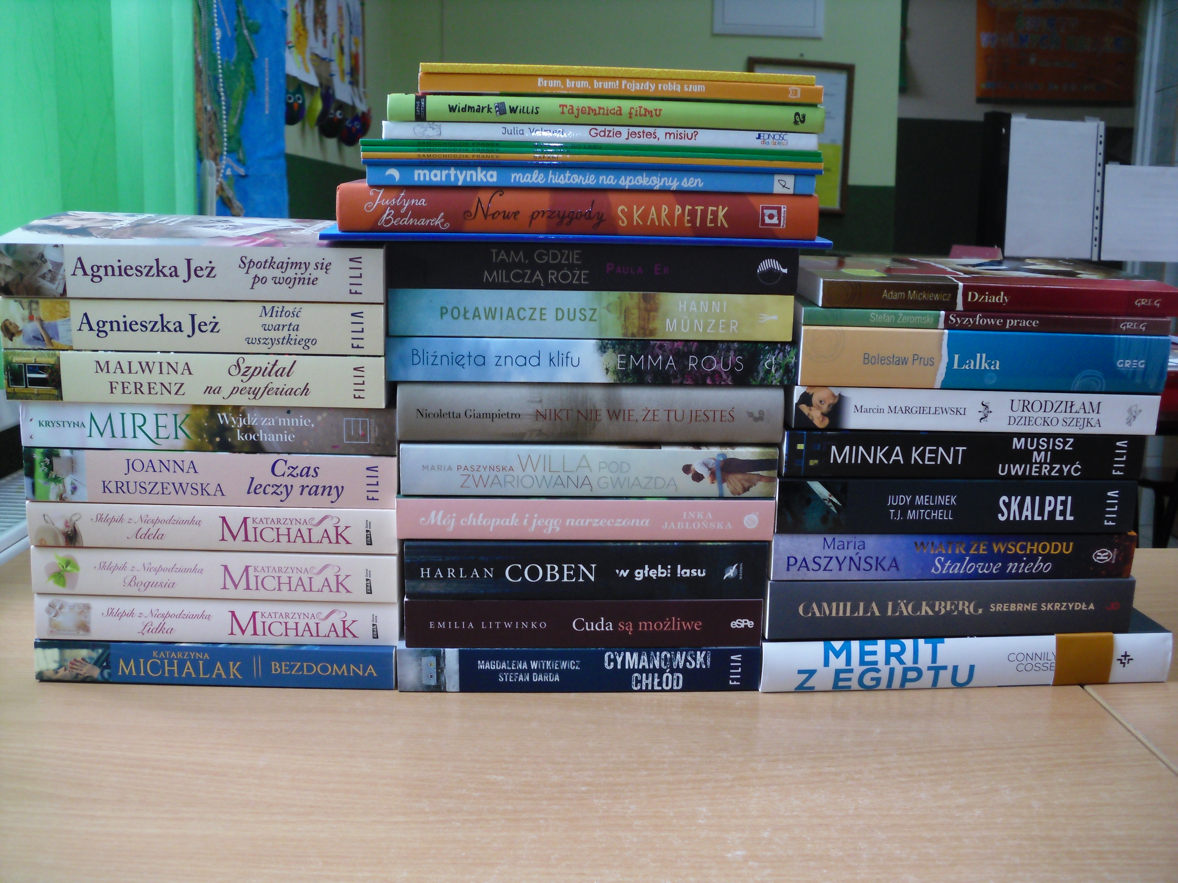 Wśród nich znalazły się kontynuacje wcześniej zakupionych tomów, takie jak najnowsza powieść R.P. Evans ,,Świąteczny nieznajomy’’ to świąteczna i zarazem druga część z "Serii z Noel". Książki te można jednak czytać osobno, bo są to odrębne, niezależne od siebie historii, czy lubianej A. Krawczyk seria; Ulica Wierzbowa, która składa się z trzech tomów. Z literatury obyczajowej J.Tekieli ,,Szlak srebrnych skrzydeł’’ to pasjonująca opowieść o człowieku i jego wewnętrznej sile, E. Świętek ,,Pełnia szczęścia’’ jest to lekka książka z humorem , N. Socha ,,Godzina zagubionych słów’’ to ciepła i klimatyczna świąteczna powieść, K. Mirek ,, Nowy podarunek’’ piękna, magiczna opowieść o podarunkach losu i magii Świąt, K. Michalak ,,Ścigany’’ to powieść, od której nie można się oderwać, M. Majcher ,,Najważniejszy’’ poruszająca opowieść o rodzicielstwie, niespełnionej miłości, S. Kubiak ,,Pod naszym niebem’’ to cudownie ciepła podróż do pięknej wsi na Powiśli, T. Kieres ,,Kilka słów o miłości’’ fascynująca historia o miłości i przyjaźni, A. Jeż ,,Zwyczajne cuda’’ to powieść idealna na święta, I. Jabłońska ,,Imbirowa miłość’’to ciepła powieść w sam raz na długie zimowe wieczory, I. Gołębiewska ,,Pragnienia’’ to wyjątkowa historia o młodych ludziach, I. Frączyk ,,Do trzech razy sztuka’’ to kolejna powieść tej autorki, która znalazła się w naszej bibliotece. Literatura piękna J. Moyes ,,Dwa dni w Paryżu’’ opowieść o odwadze i sile miłości, J. Koprowicz ,,Otchłań’’ historia, w której śmierć, świętość i bluźnierstwo stają się jednością, K. Hannach ,,Zdarzyło się nad jeziorem Mystic’’ promienna opowieść, która przenika do najgłębszych, najwrażliwszych zakątków naszych serc czy D. Chamberlain ,,Małe miasto, wielkie kłamstwa’’ opowieść o zagadkowej intrydze. Z kategorii biografia J.L. Klein ,,Dotknąć nieba’’ poruszająca powieść o podróży do Nieba i z powrotem, czy A. Puścikowska ,,Wojenne siostry’’ niezwykłe historie bohaterskich kobiet, a z kategorii religijne A. Johnson ,,Nieplanowane’’ książka, która porusza bardzo trudne tematy na jej podstawie powstał film. Polecamy również literaturę faktu J. Warte ,,Z raju do piekła’’ to wstrząsająca i inspirująca opowieść. Miłośnikom sensacji proponujemy nowe kryminały G. McAllister ,, Wszystko co powiesz’’, H. Coben ,,Chłopiec z lasu’’, M.H. Clark ,,Mam na ciebie oko’’, W. Chmielarz ,,Prosta sprawa’’, S. Beckell ,,Zapach śmierci’’.