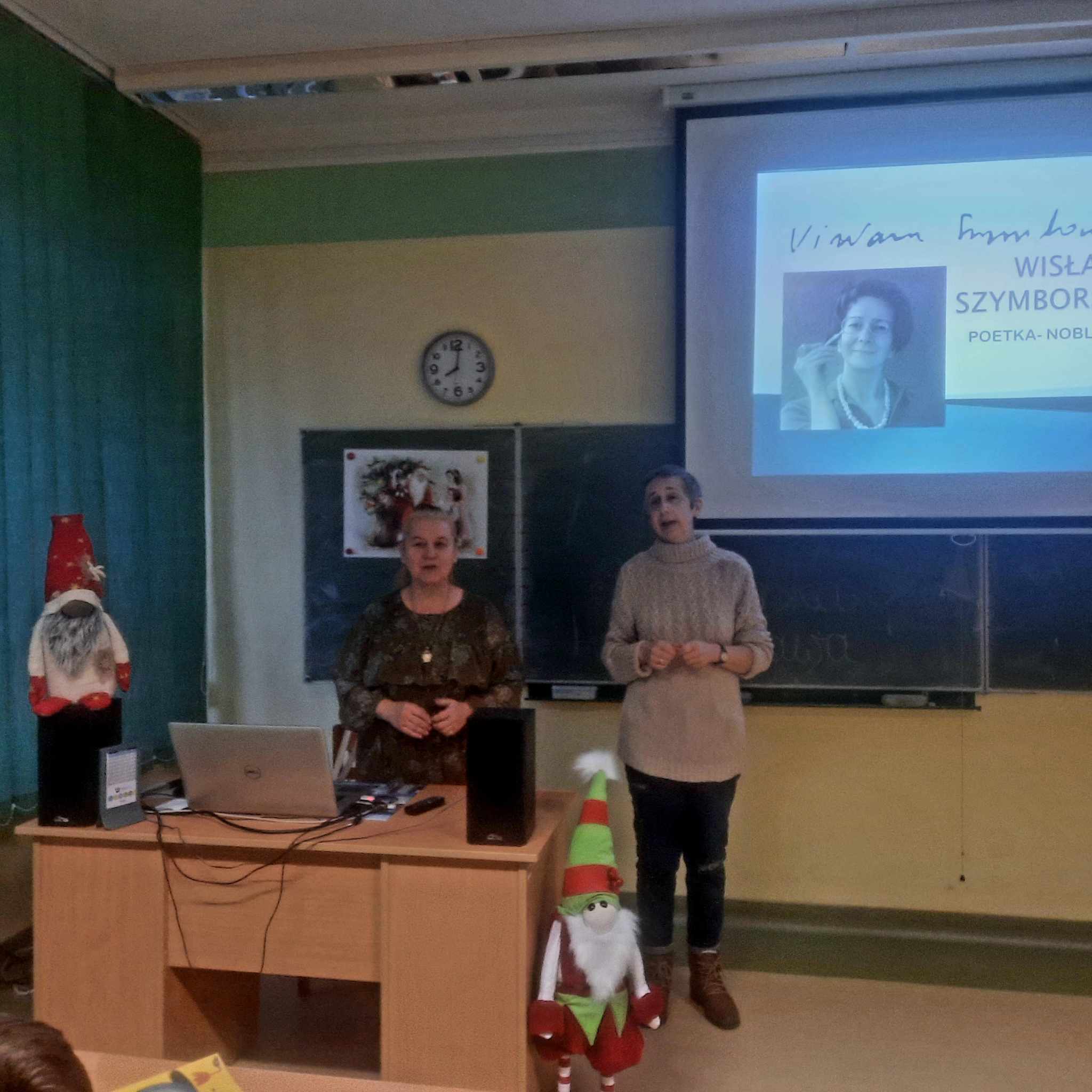 Początek lekcji zmienił się w poetycki poranek, gdyż uczniowie, pod kierunkim, p. Jolanty Kłósek, przygotowali krótki występ słowno - muzyczny złożony z wierszy noblistki. Zabrzmiała także ostatnio będąca na topie piosenka Sanah do słów Szymborskiej: „Nic dwa razy się nie zdarza…”